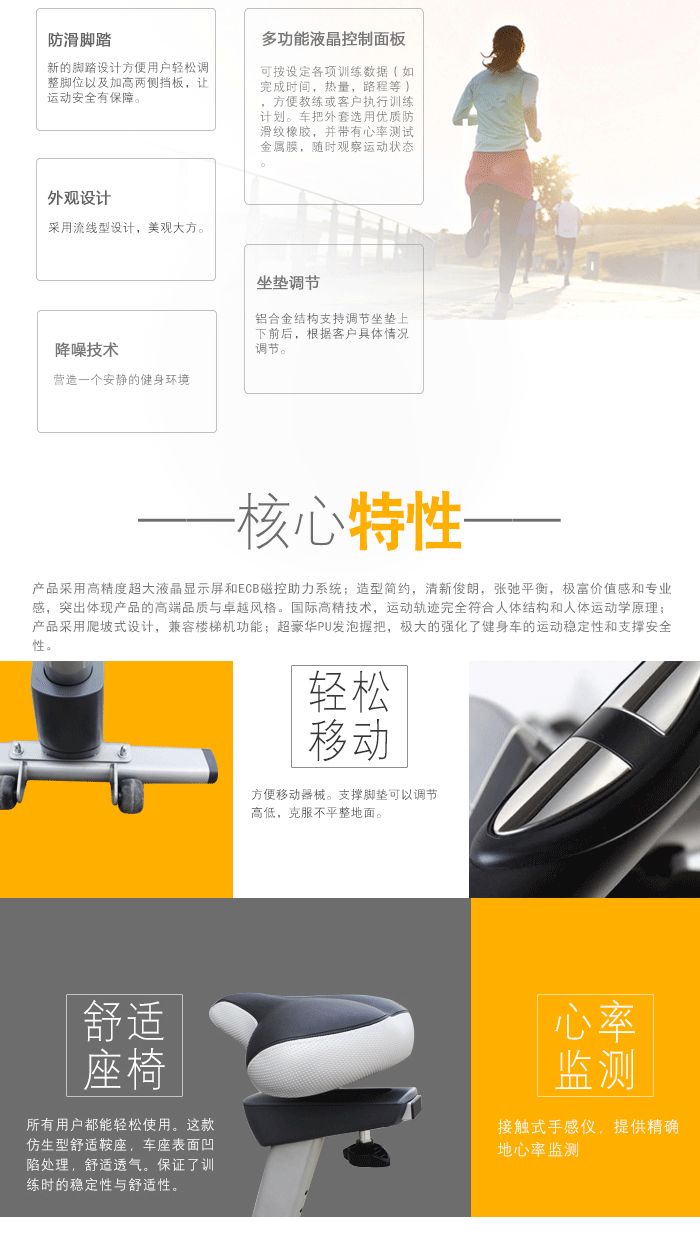 | 心率显示 | 实时显示心率,输入年龄和体重后,可帮助用户保持在燃脂、有氧或峰值目标区域中,更有效地进进行心肺训练和减重。 |