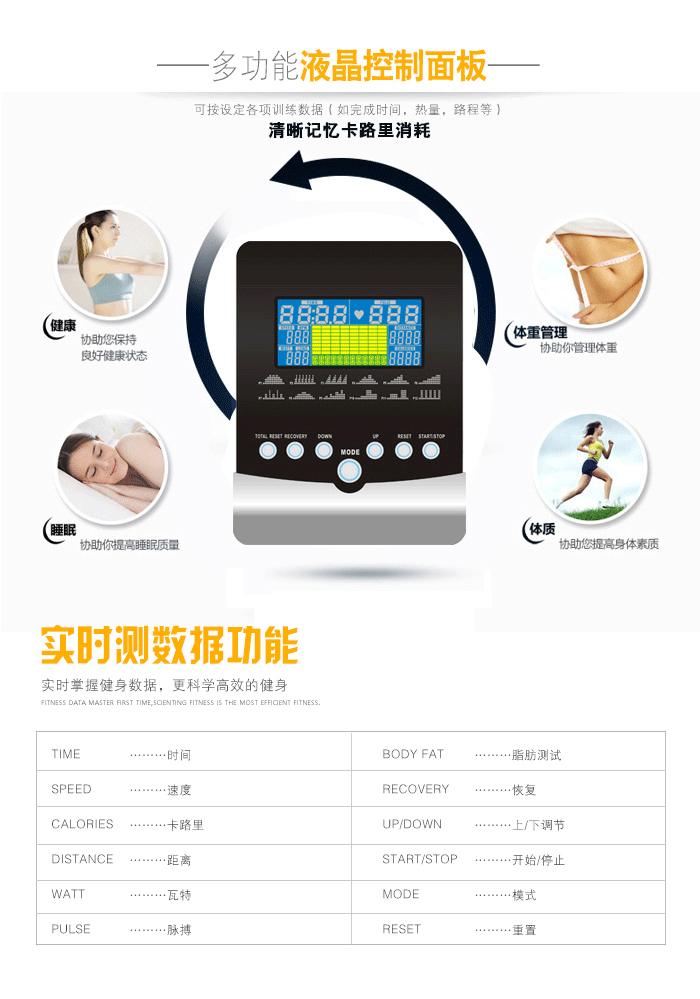 | 预设程序(LCD) | 距离倒计时模式,卡路里倒计时模式,时间倒计时模式 |