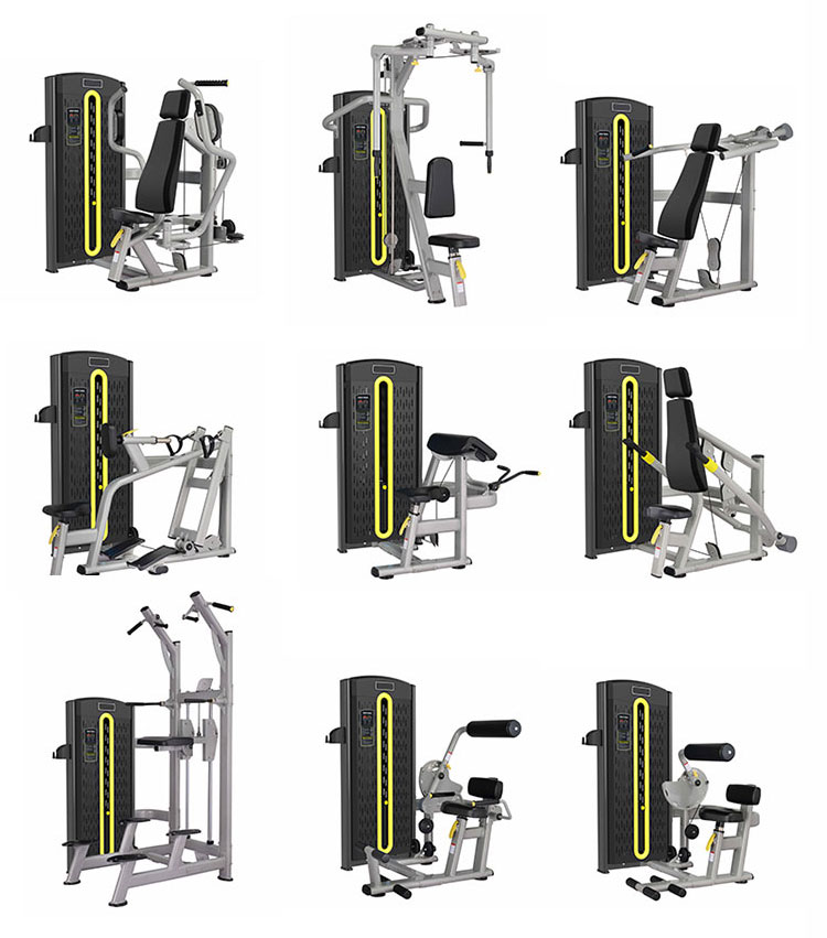 插/挂片式力量健身器材是指通过插入或挂上不同数量的重量片来调节训练强度的健身器材,通常有固定的运动轨迹和功能,适合初学者和专业运动员使用。包括坐式推胸训练器、蝴蝶扩胸训练器、直臂夹胸训练器、二头肌训练器、引体向上训练器、高拉训练器、大腿内外展训练器、轮胎机、45度倒蹬机、多功能腹肌训练器等。