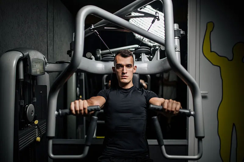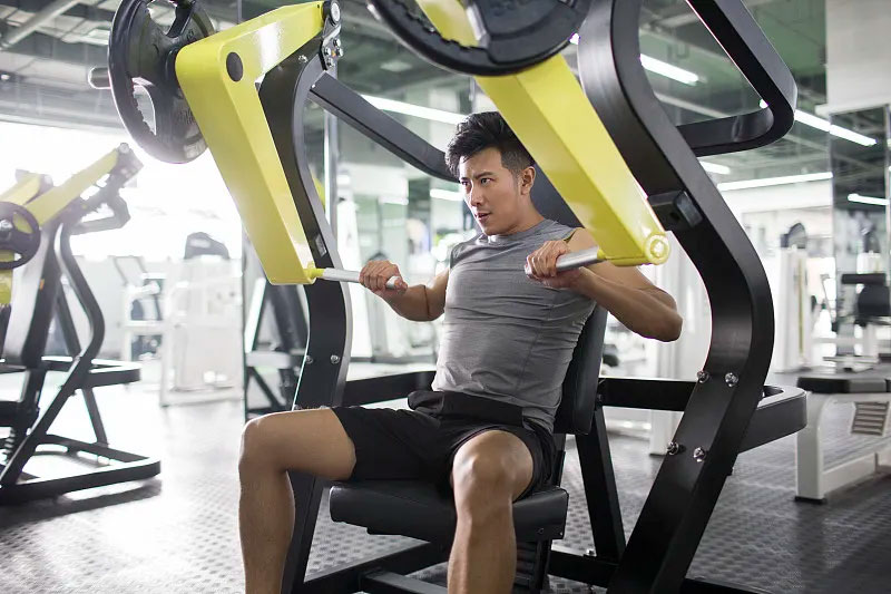 2、坐式推胸训练器:坐式推胸训练器是一种常见的固定练胸肌器材,锻炼部位包括:胸大肌,三角肌,肱三头,肱二头肌等。操作简单,安全性高,特别适合初学健身爱好者。
