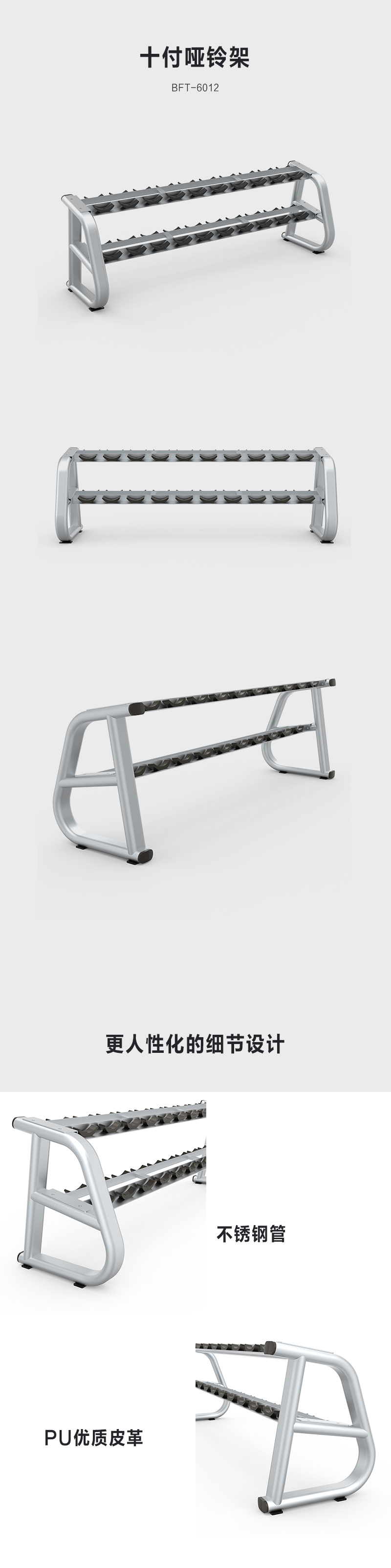 BFT-6012 BFT-6012十付哑铃架 参考价:¥3360 1、管材:平椭管110*60*3.0和角钢,SPHC材料,强度大稳定; 2、哑铃托:PP或者ABS 尺寸:2500*730*860mm 毛重/净重:118/95KG 获取报价